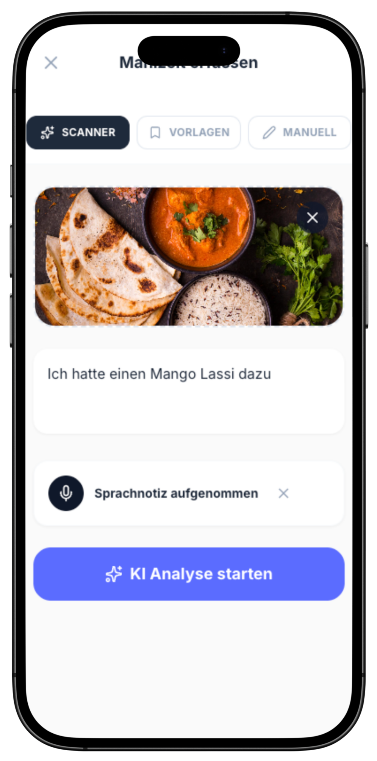 Vergiss mühsames Suchen in Datenbanken. Nutze die Freiheit, deine Mahlzeiten so zu erfassen, wie es gerade passt – die heyristic KI versteht den Kontext sofort.